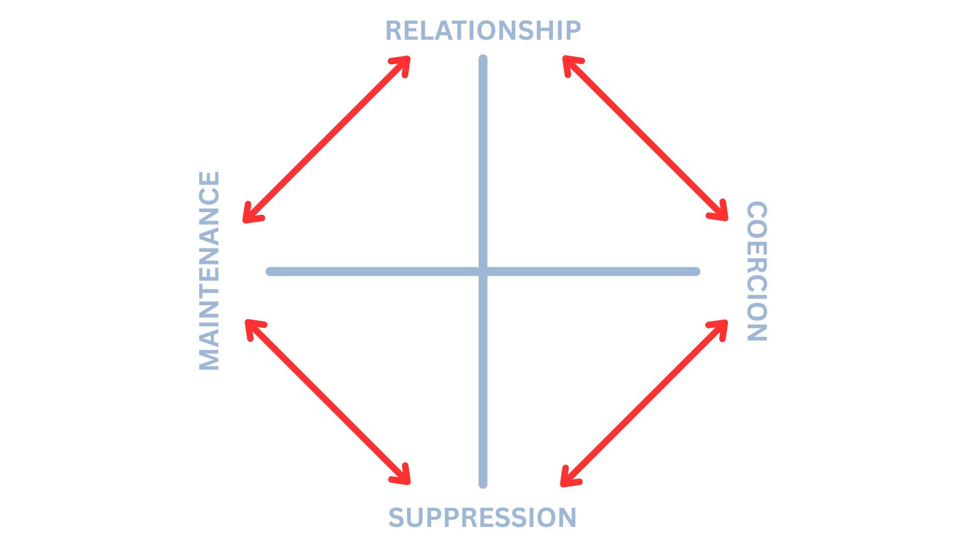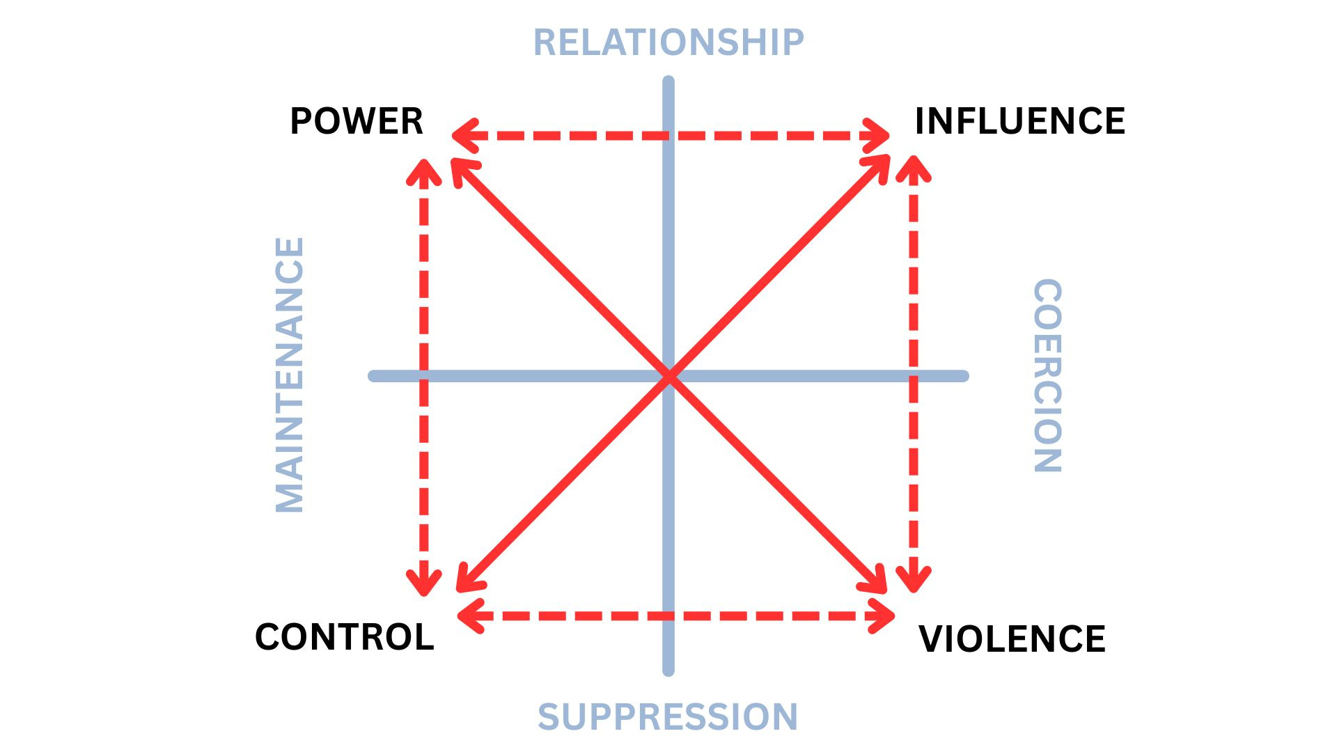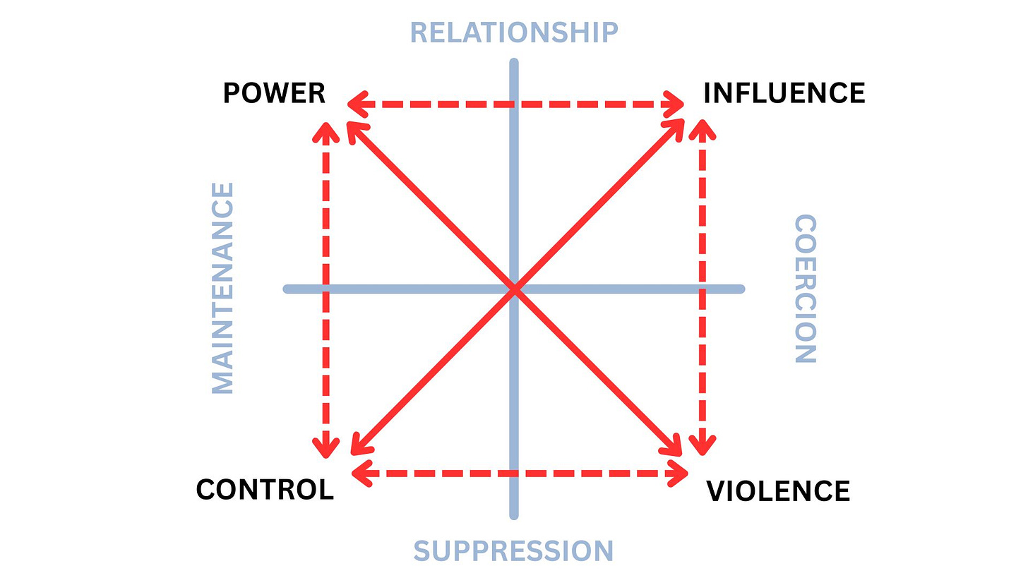 VIOLENCE and INFLUENCE manifest as COERCION - Here, coercion if the opposite of maintenance. Coercion erases the particulars, and seeks to impose outcomes on the lived needs and experiences of each individual person. In this construal, a shoddy cosmetic “repair” to a damaged system is a form of coercion, as it seeks to create a false impression and a deceptive trust in the minds of those who need to use the ill-repaired mechanism or thing. We also can see that the direct use of force to constrain agency and limit outcomes are very visible forms of coercion. Coercion destroys relationships.