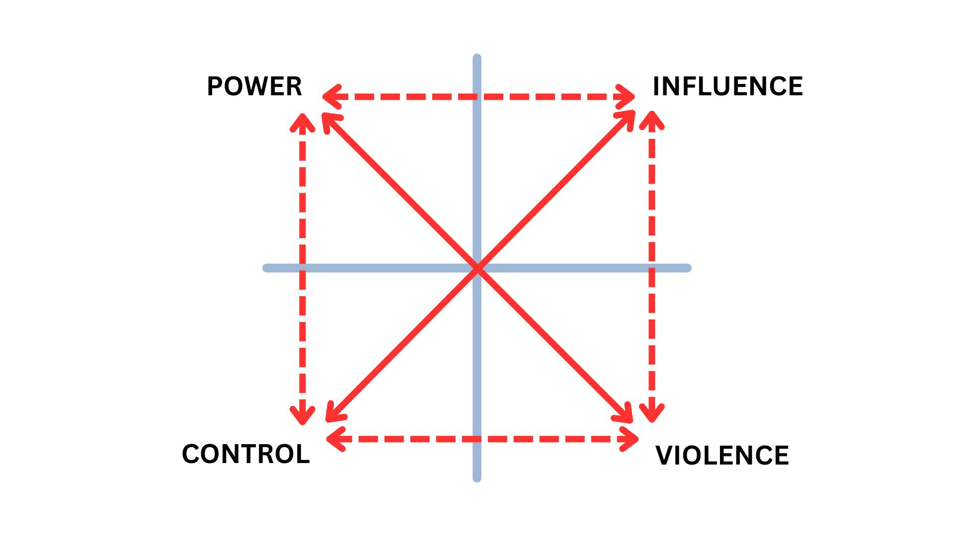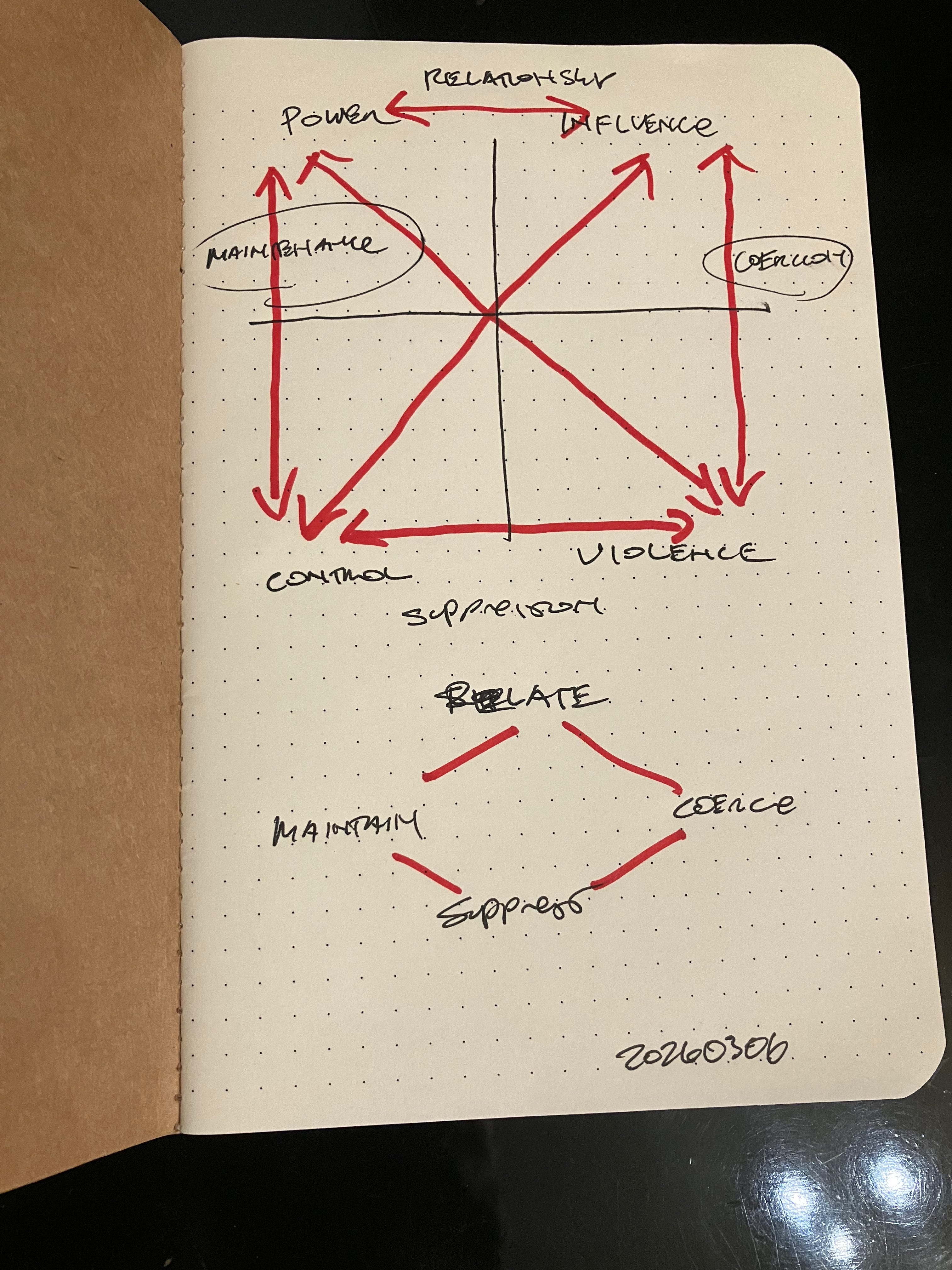 So I pulled out my notebook and started sketching. I like quadrilaterals because they allow you to see tensions. You put one concept (“power”) in one corner, and you put another concept (“violence”) in the diagonal, and suddenly you have this tension between them.