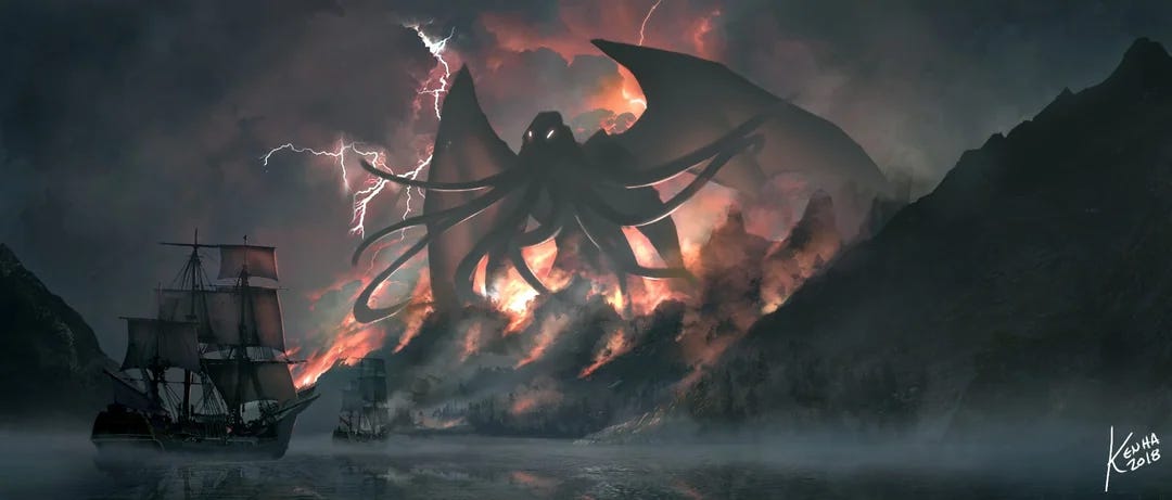 There is another style of monster, though. This is the kind of monster that inhabits the stories of writers like H.P. Lovecraft. These monsters are often referred to as The Old Ones, and the genre of stories and media that feature them are referred to as cosmic horror. Probably the best known of these monsters is the dread Cthulhu.