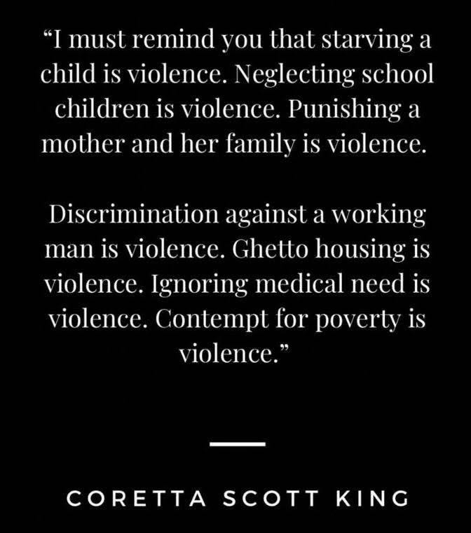 Violence, then, is the goal (a world where I and mine have access to abundance and life and where you and yours are trapped without agency in a regime of limited resources designed to lead you to a premature death). Violence is the strategy to meet that goal, and the tactics that we use to manifest this strategy are also violent. Little organized abandonments grow up to be big organized abandonments. Momentary organized abandonments and momentary arrangements towards premature death grow up to be big and constant arrangements towards premature death.