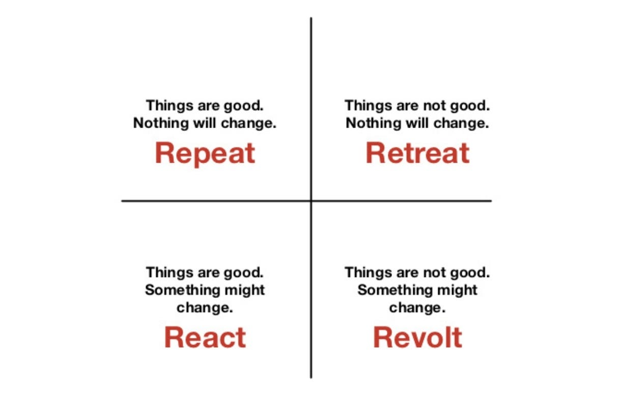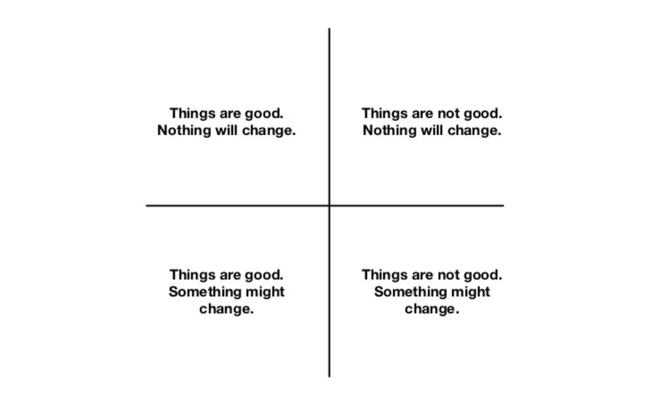 When things are not good, but we sense the possibility that something might change, then we might naturally enter into a posture of revolution. We revolt against the status quo, the realms of injustice, or systems of violence. We revolt in the name of what we imagine might be improved. This quadrant is often where most of us would like to imagine ourselves: gallantly storming the ramparts and putting our shoulders to the wheel, we do our all to move the world in the direction of “progress.”