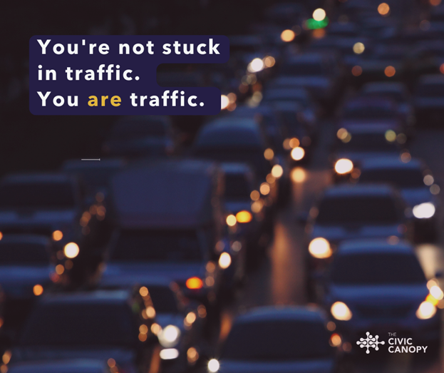 Imagining ourselves stuck in traffic, we imagine that somehow the traffic might be changed apart from our banal and everyday participation. We imagine the traffic might change despite us, and therefore we might never have to change. But traffic will only change if we and others change. We must re-integrate our understanding of our individual behaviors as part of the collective, emergent reality that is the traffic. Our complaint about those conditions around us is, ultimately, a complaint about ourselves.